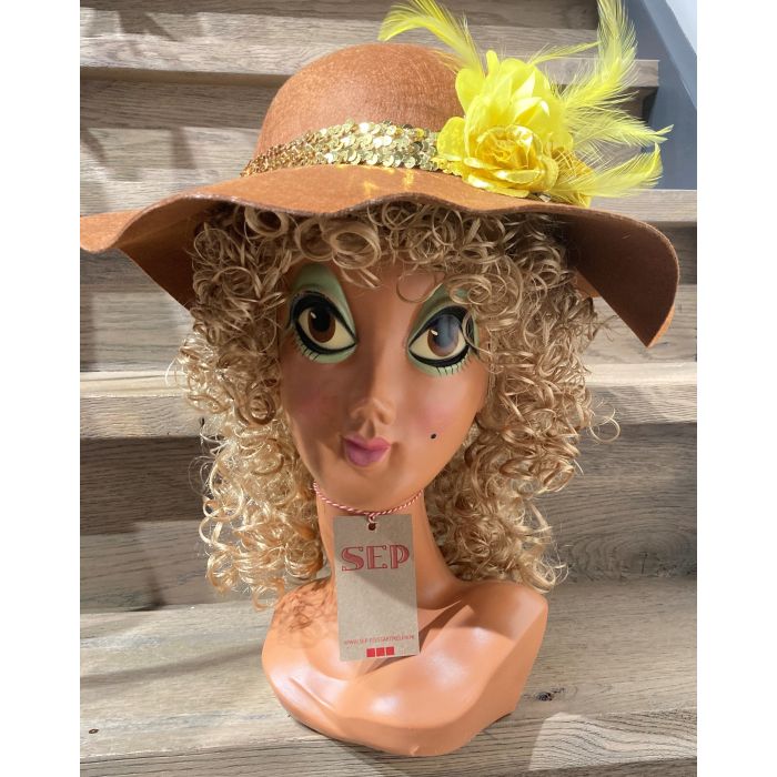 Een kleine gele roos met veren. De gele bloem/roos kan je bevestigen op een hoed of op je carnavalsjas d.m.v. een speld en/of clip.