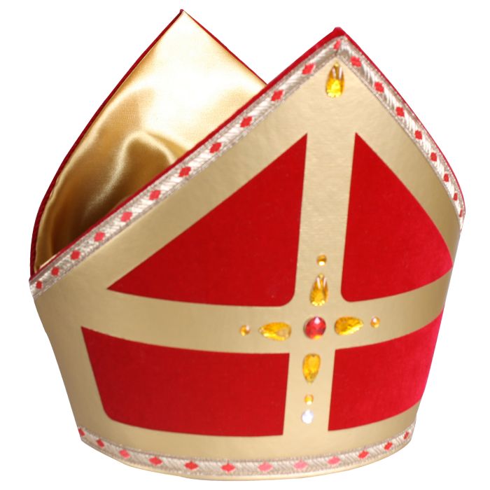 TV Kokermijter Stefan, dit pronkstuk heeft de look van onze enige echte sinterklaas, katoen fluweel met goudkleurige folieprint, ook de versiering qua galon en steentjes is perfect.