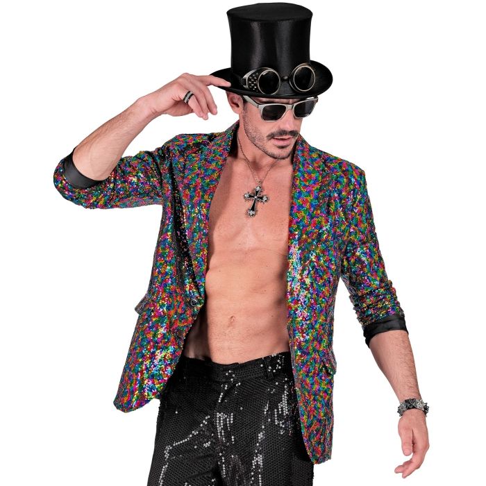 Maak je klaar voor de foute Party met ons Heren colbert in multicolor! Dit jasje, gemaakt van schitterende Pailletten stof, zorgt ervoor dat je altijd in het oog springt. Met een speelse animal print en een foute look ben jij de ster van elk feest. Combineer het colbert met andere items uit onze webshop voor een complete outfit!