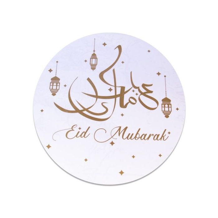 De sticker heeft een doorsnee van 46cm. Eid Mubarak is een traditionele Islamitische groet die letterlijk vertaald 'gezegende feestdag' betekent. De groet kan slaan op zowel het Suikerfeest als het Offerfeest.