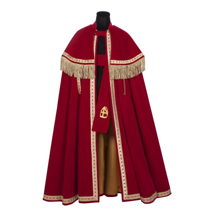 Sinterklaas pak Stefan 2dlg. licht rood fluweel (Brede mantel). Dit Sinterklaas kostuum bestaat uit 2 delen, een smalle mantel en de stola. De habijt en mijter en alle andere Sinterklaas accessoires zijn los te bestellen in onze webshop.Let op! Dit Sinterklaas Kostuum is een versie van de Sint Stefan!Het Sinterklaas pak heeft een brede mantel, is gemaakt van mooi echt fluweel en is luxe afgewerkt!