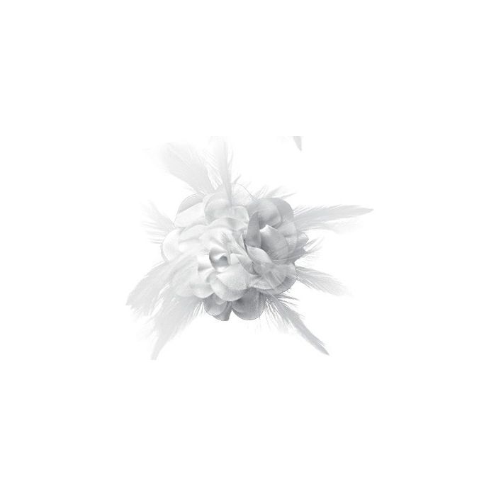 Een kleine witte roos met veren. De witte bloem/roos kan je bevestigen op een hoed op op je carnavalsjas d.m.v. een speld en/of clip.